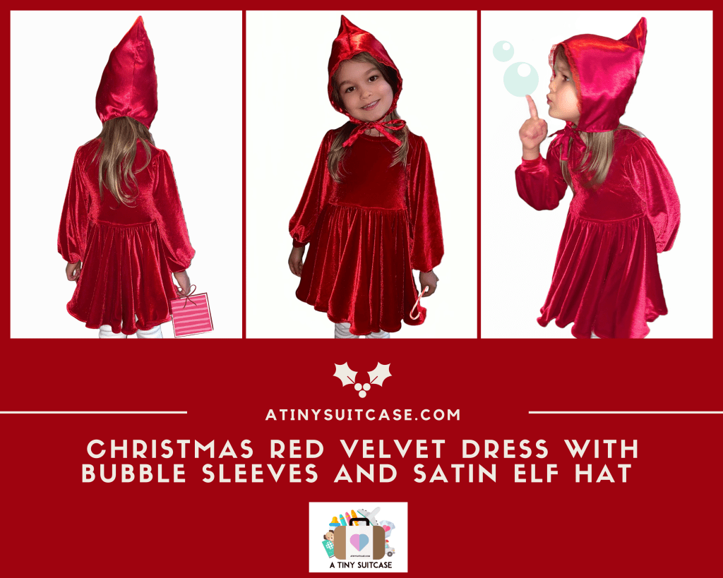 Today I made my daughter a red velvet Christmas dress with bubble sleeves and combined it with her red satin Elf/Gnome hat I made her last week.